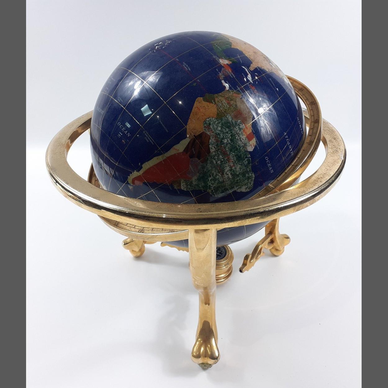 A claw-footed brass-mounted earth globe set with multiple semi-precious stones stands 48cm tall. One of the pedestal legs is loose