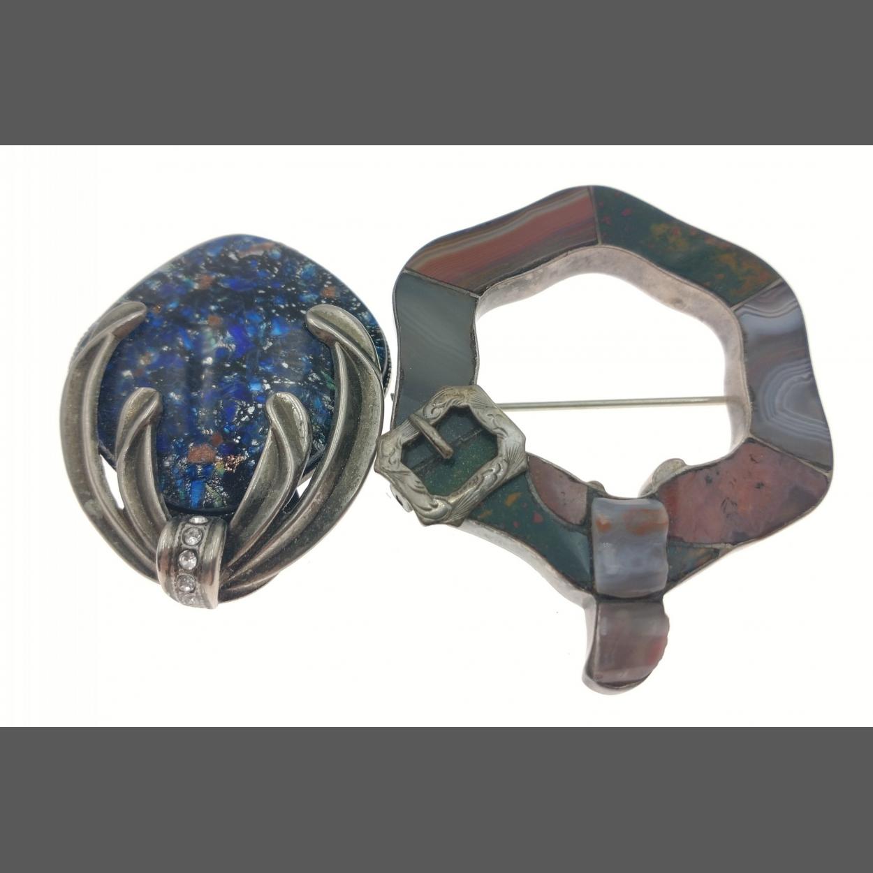Two QUALITY UNUSUAL SCOTTISH brooches on white metal - sizes of the larger 2" x 1.5" approx