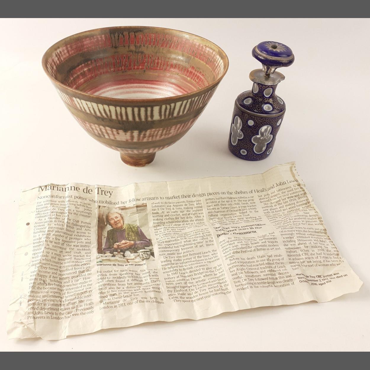Marianne de Trey decorated conical pottery vase in lovely condition 12cm tall with impressed seal mark, a lovely item in excellent condition. Comes with a enamelled glass scent bottle (damaged).