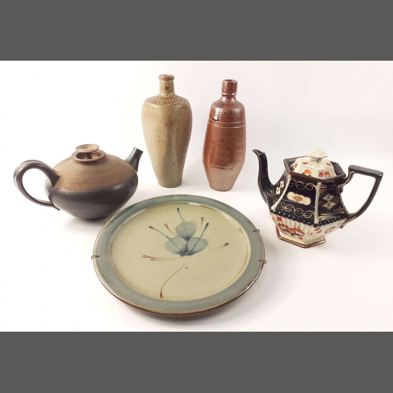Small collection of STUDIO art pottery items to include a lovely pottery teapot with lid, two Portuguese style vases 24cm tall, a 27cm wall plate and an older style teapot.