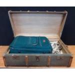 A large wooden banded travel trunk with brass corners 90x55x35cm approx, with wear in useable condition and contains a travel bag