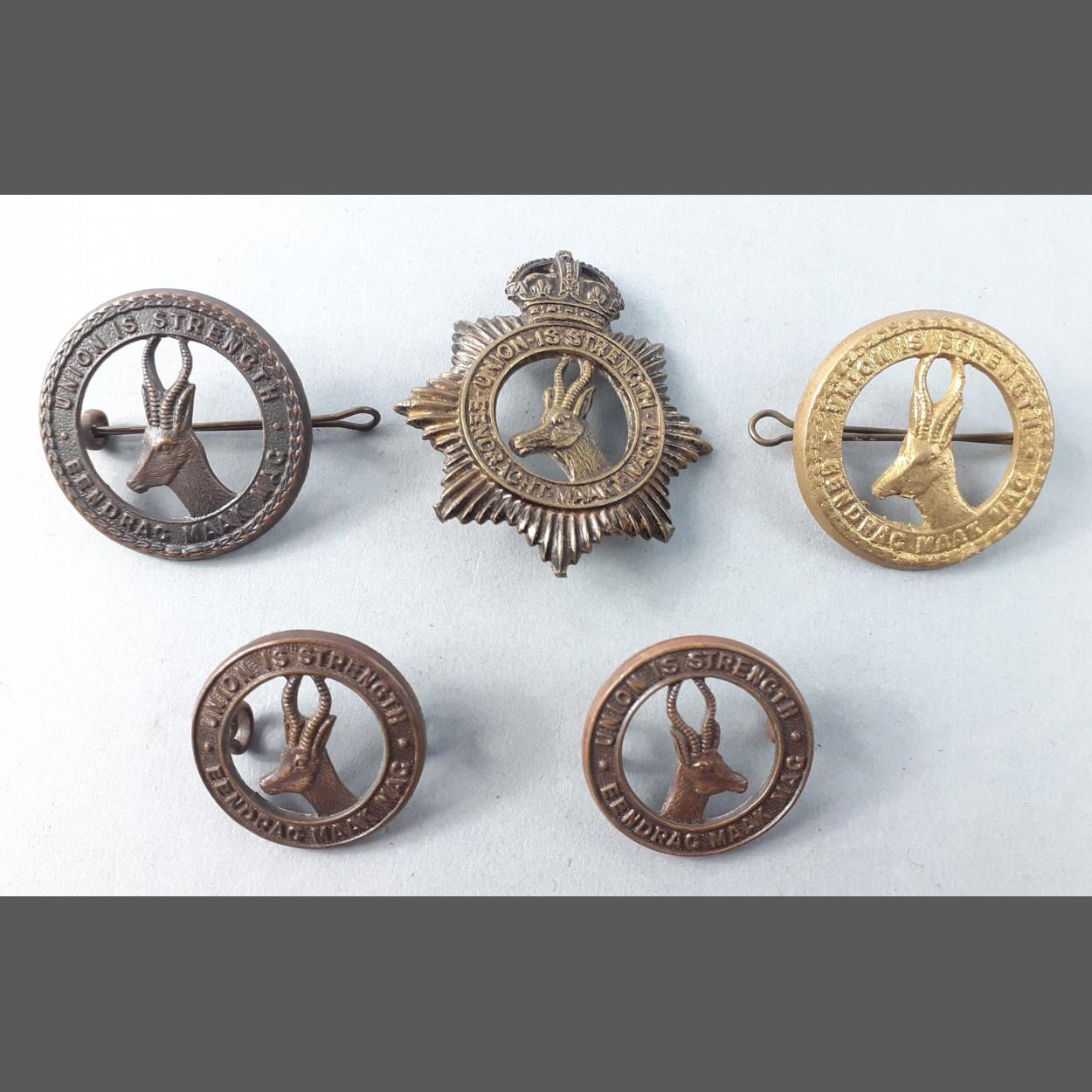 WWII Era military badge group. South Africa General Service Union is Strength Cap Badges one with Kings Crown and shoulder insignia (opposing facing pair). Badge is 32mm approx.