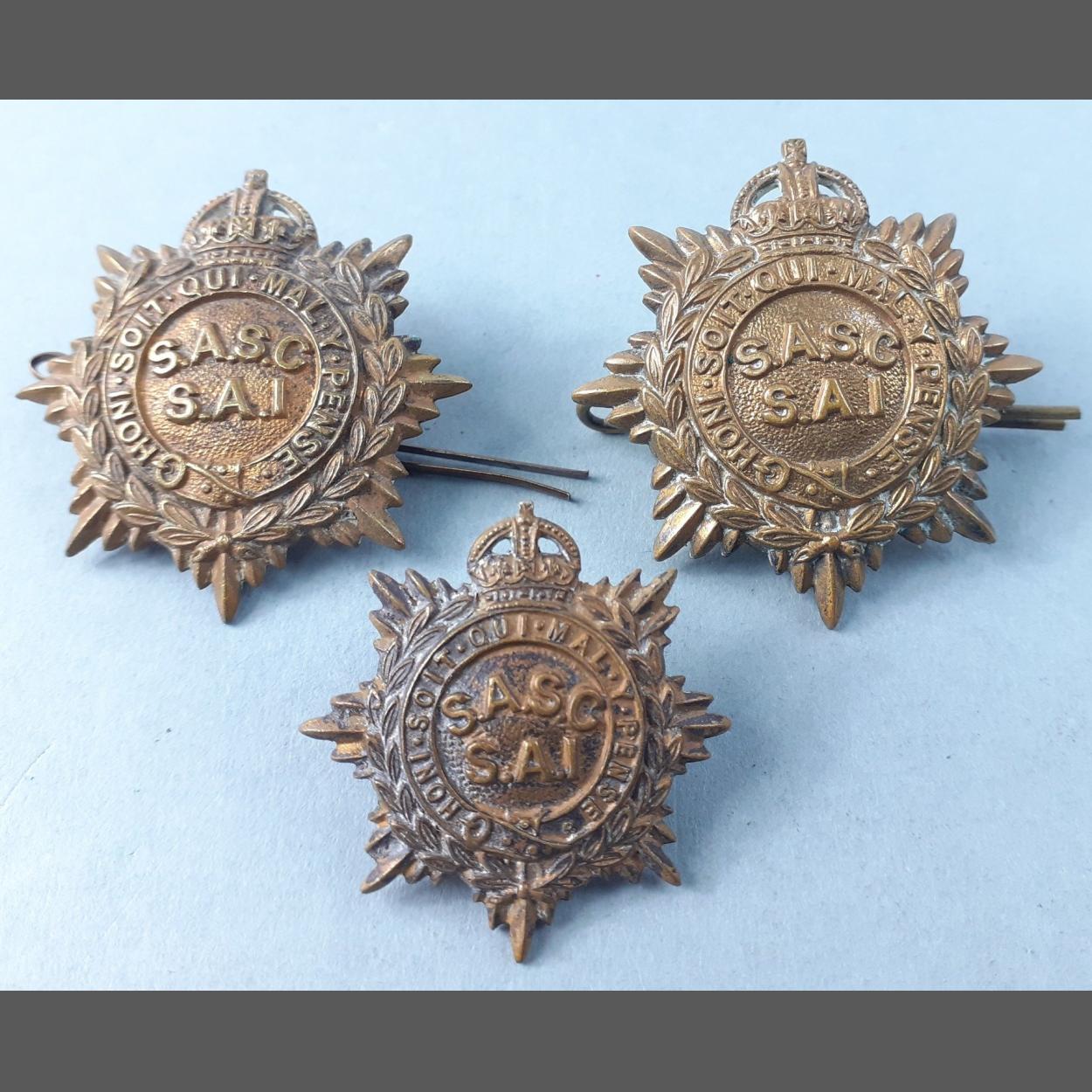 Military brass badges. S.A.S.C S.A.I. South African Service Corps. All three in good collectible condition.