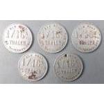 Rare African coinage of numismatic interest. DJIBOUTI: aluminum 1/16 thaler, ND (ca. 1920), Lec-98, Prasso, concessions in Abyssinia x 5 . Scarce lot.
