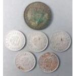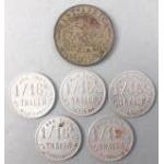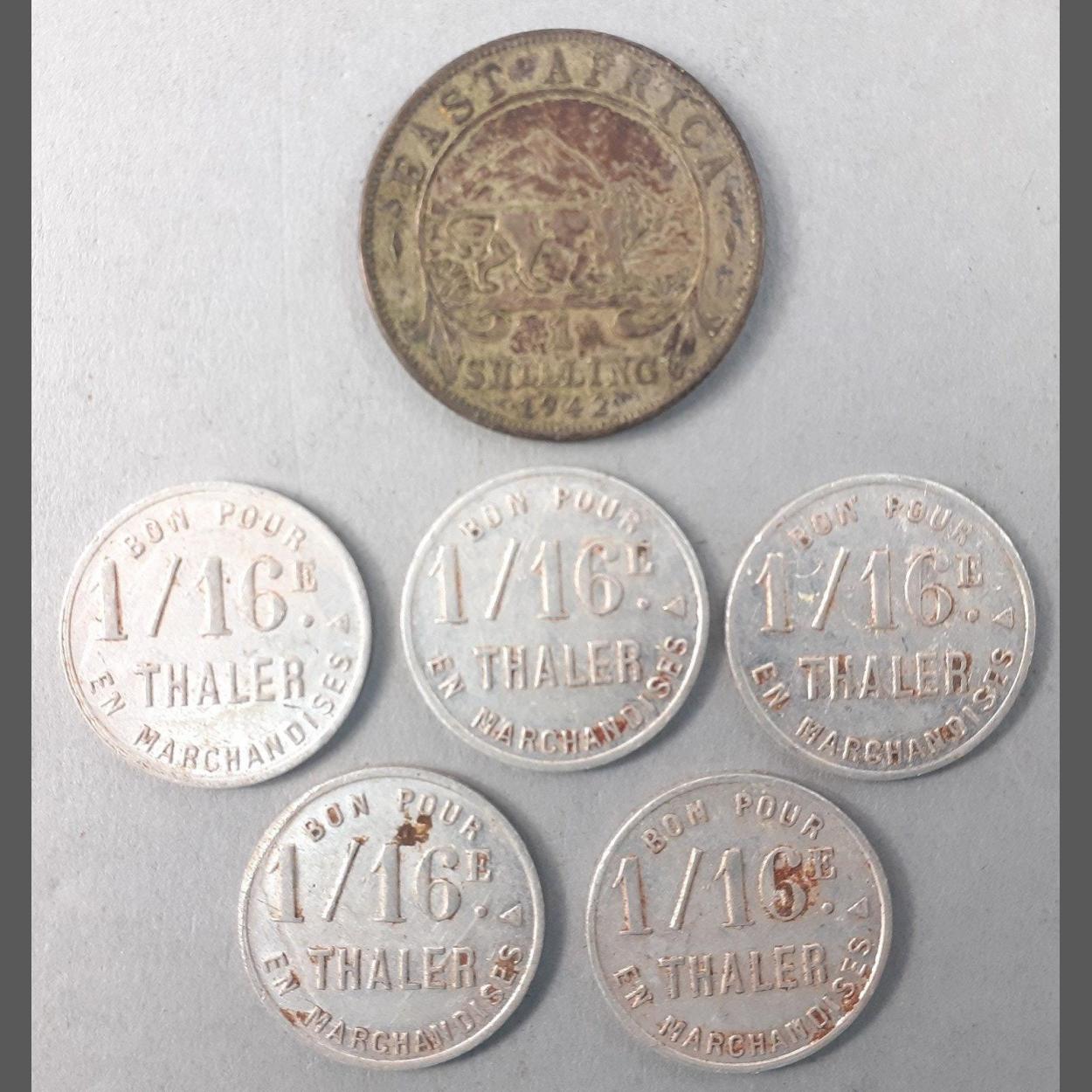 Rare African coinage of numismatic interest. DJIBOUTI: aluminum 1/16 thaler, ND (ca. 1920), Lec-98, Prasso, concessions in Abyssinia x 5 and a 1942 East Africa Shilling. Scarce lot.