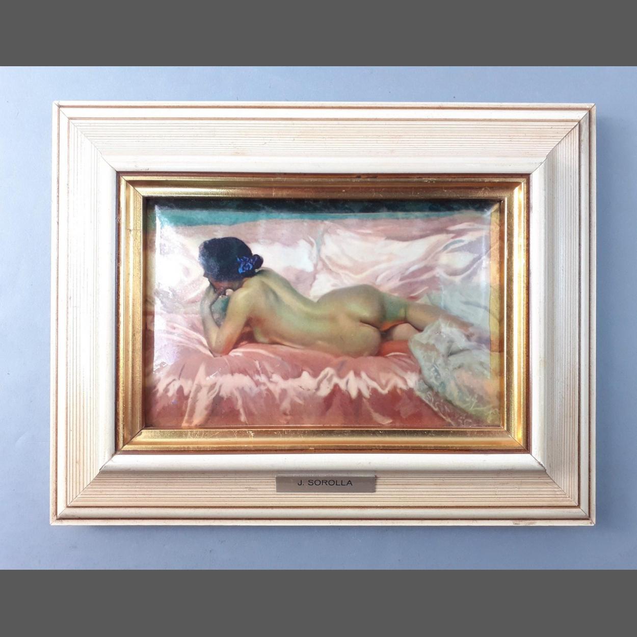 An interesting small ceramic Spanish wall plaque. Attractive nude women in repose with muted colours. Frame size 23 x 18 cm. Plaque number J.Sorolla