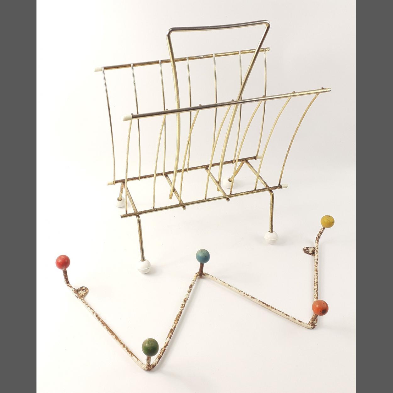 Could this lot be anymore 1970's??? A sputnik style magazine rack which is 40 cm tall approx and a 5 peg coat rack- 50cm approx across. Both in need of refurbishment.