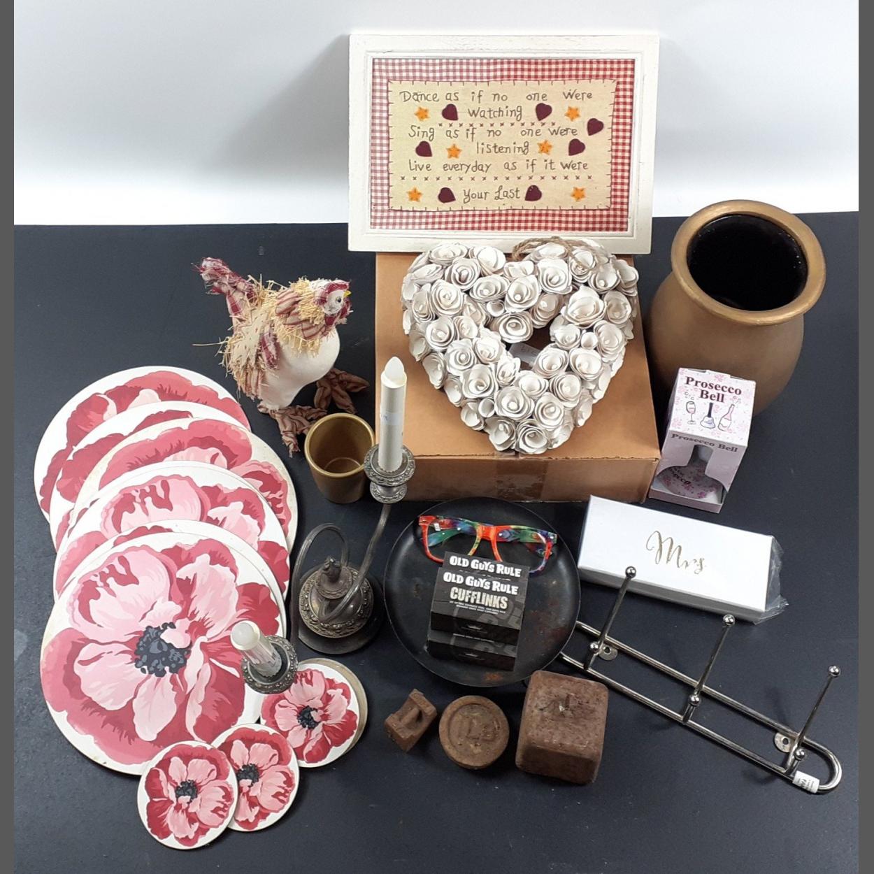 A mixed lot of decorative items to include candelabra, chicken, print, decorative wreath, table mats and much more.