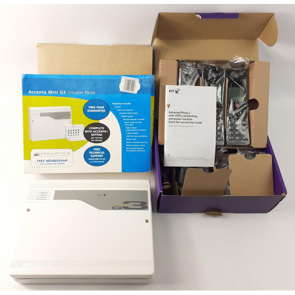 A useful triple handset BT answering phone system in a box. Appears unused and Accenta mini G3 intruder control panel