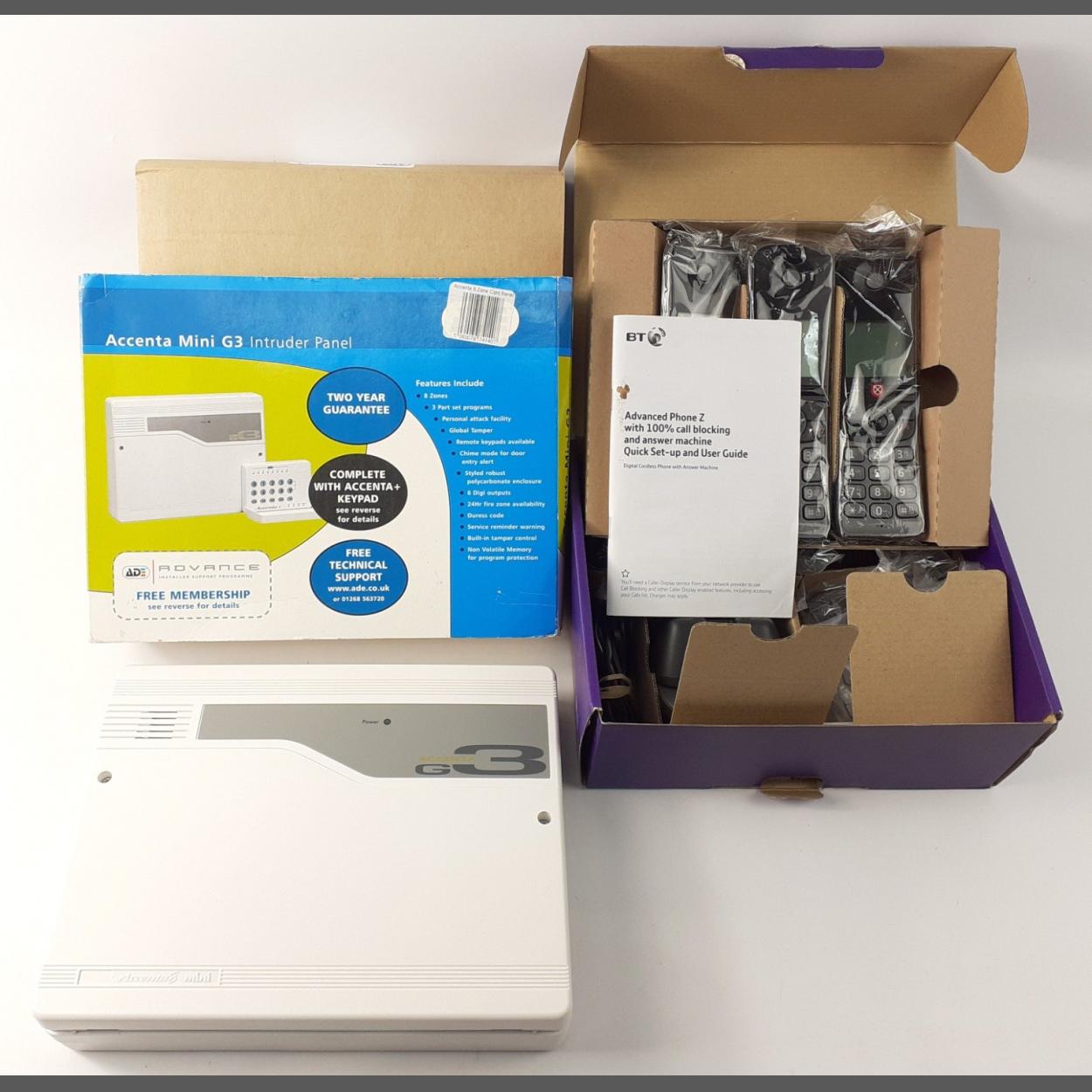 A useful triple handset BT answering phone system in a box. Appears unused and Accenta mini G3 intruder control panel