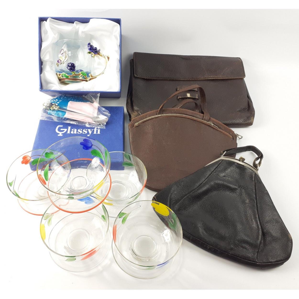 A Glassyfi ornamental cup and spoon, 5 lovely hand painted floral dessert dishes and a small selection of 3 vintage leather bags.