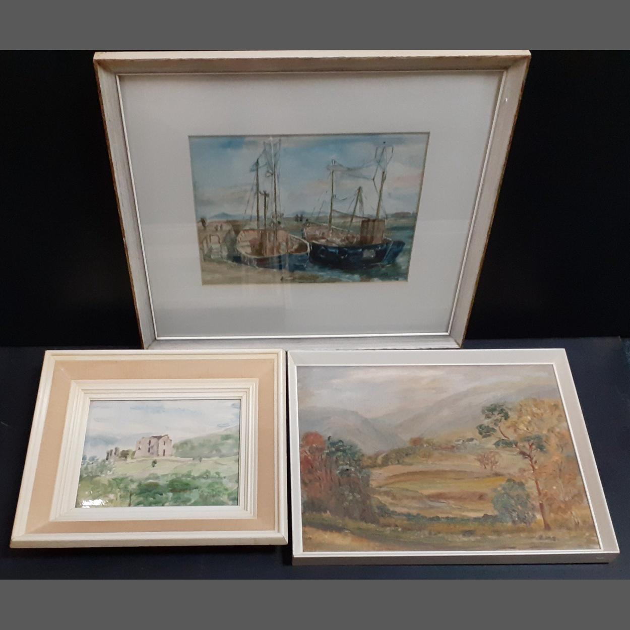 A collection of 3 artworks by local Peebles art club member JAN MELROSE SMITH comprising a framed fishing harbour scene (unidentified location), image size 33x26cm approx, framed by Thomas Baker of Peebles. One an oil on board of Manor Valley image size 44x34cm and a pretty watercolour of Elibank Castle image size 24x19cm