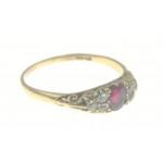 A ladies 18ct Burmese ruby and diamond dress ring with 1907 inscription with a single ruby (5mm) surrounded by 3 small diamonds on either side (tested), size U, gross weight 3.2g approx