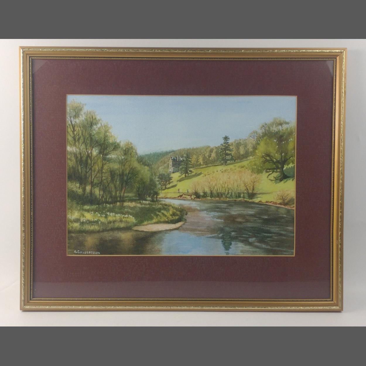 A framed and glazed original watercolour by renowned Peebles artist A. CULBERTSON, of Neidpath Castle from an unusual angle. Frame size 54x44cm approx. A very attractive and desirable scene, nicely framed