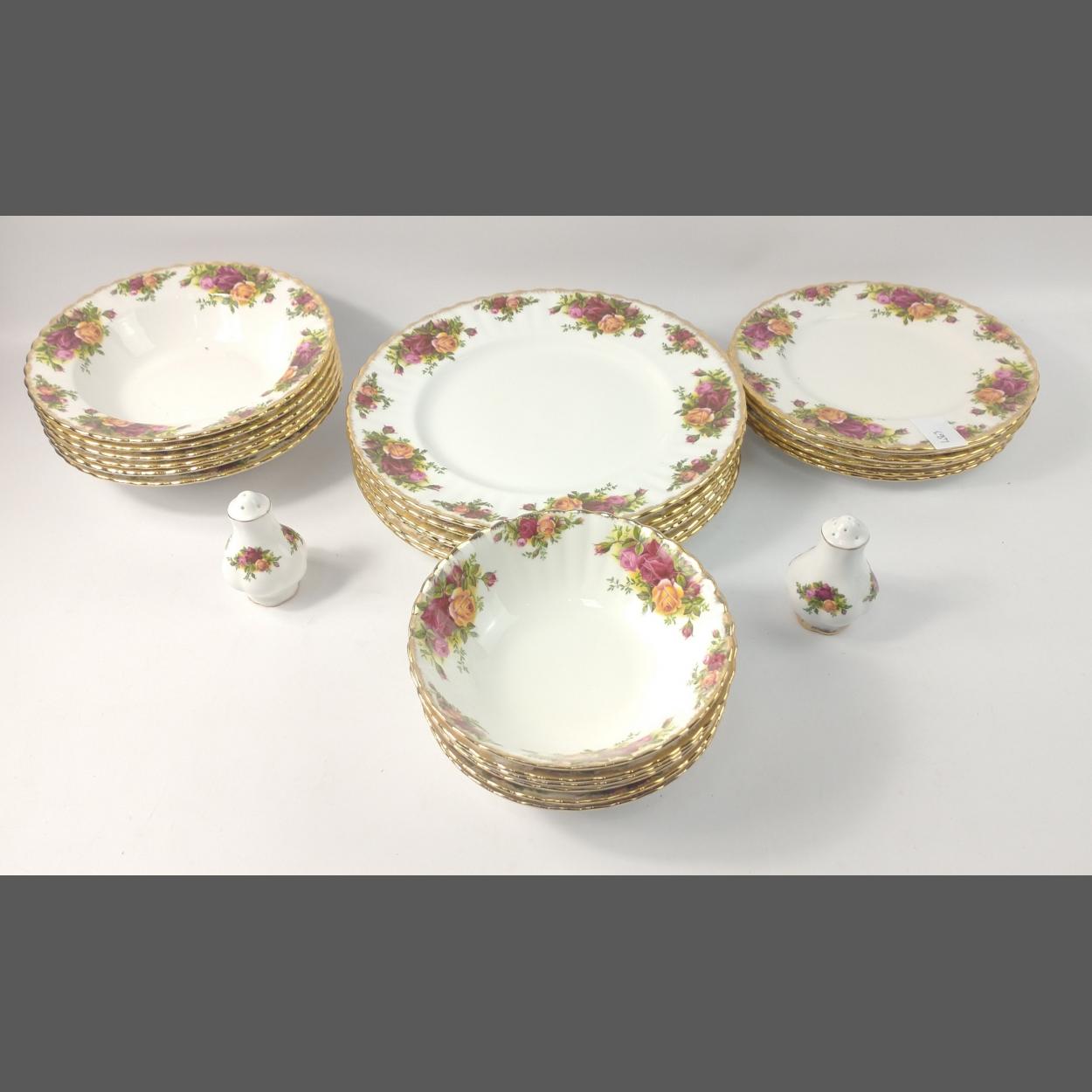 ROYAL ALBERT Old Country Roses part dinner set comprising 6x25cm plates, 6x21cm plates, 6x20cm soup bowls, 6x16cm bowls plus salt and pepper. In excellent condition
