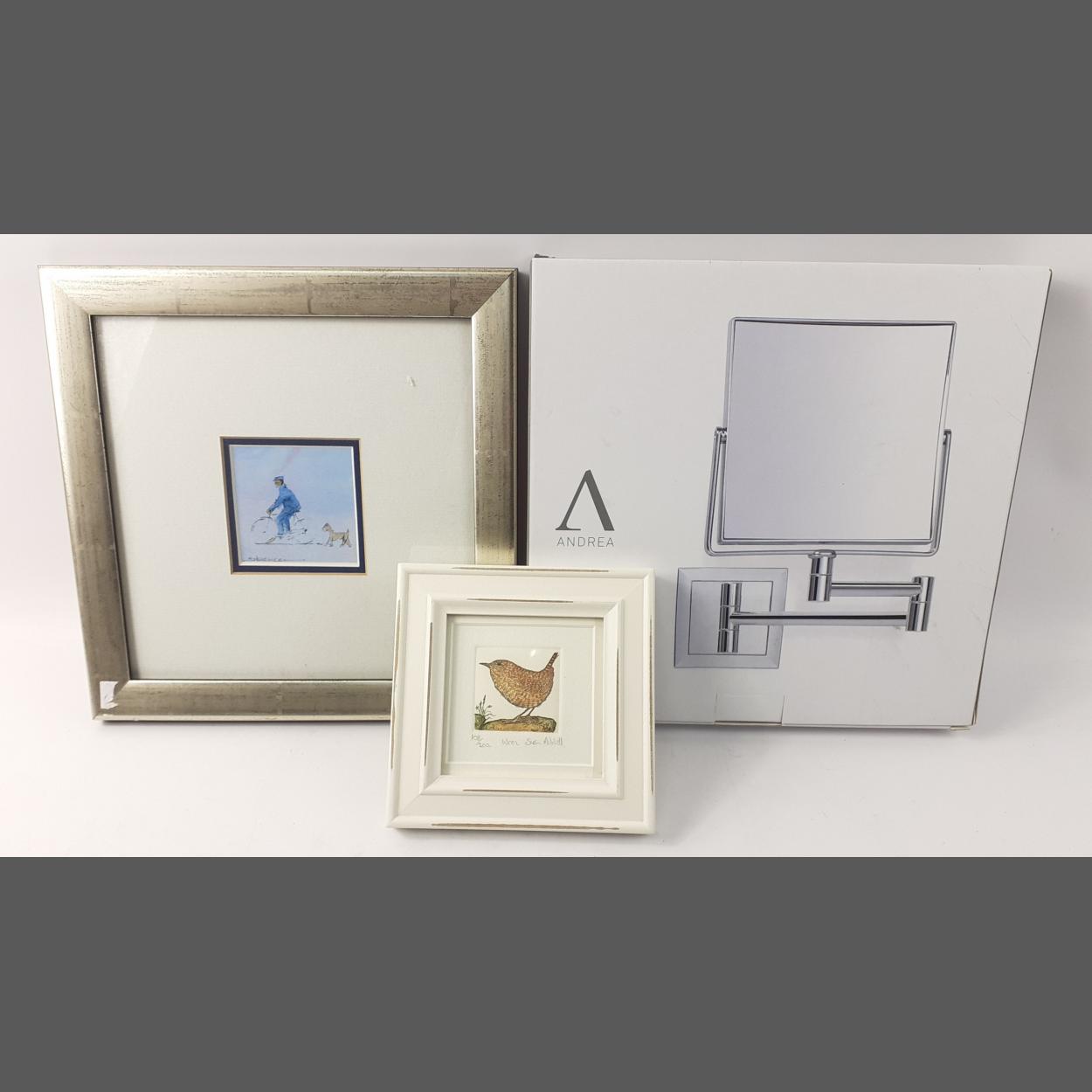 A small mixed lot consisting of a boxed unused Andrea pull out swivel wall-mounted bathroom mirror, and 2 decorative prints of a bird and a dog