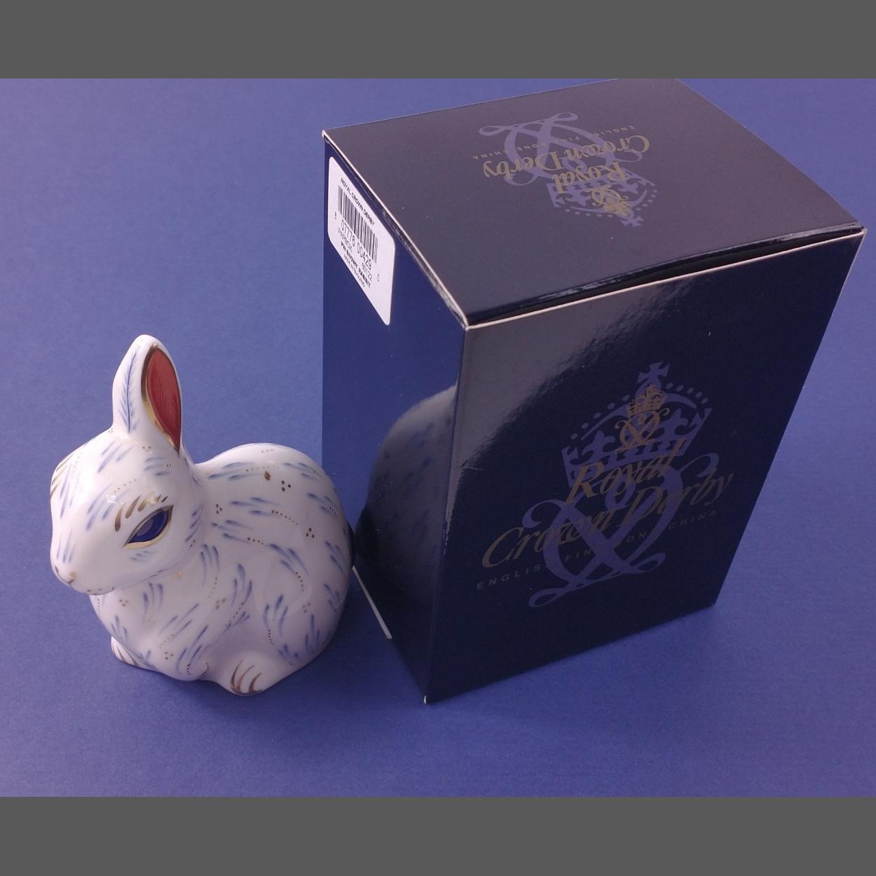 A ROYAL CROWN DERBY gold button PW Snowy Rabbit in a box. Excellent condition