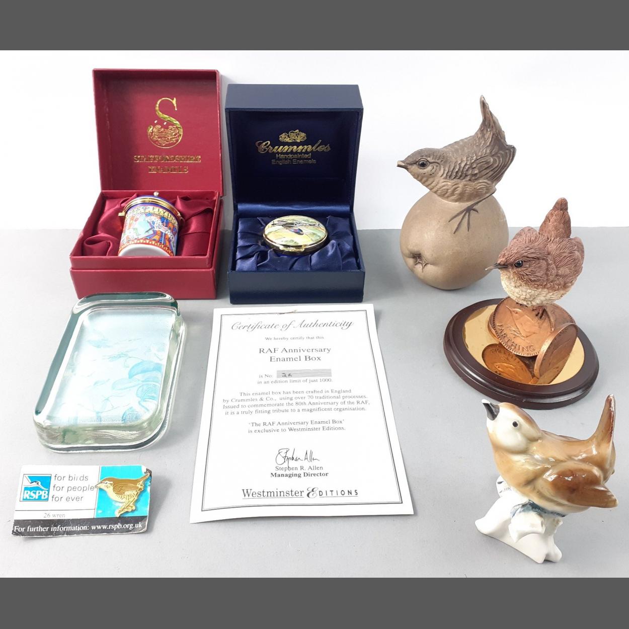 A mixed decorative lot to include a ROYAL MINT wren, a POOLE pottery wren and one other with a broken beak, a STAFFORDSHIRE enamel carousel, an enamel box and a CRUMMLES hand-painted Spitfire trinket box and an English glass paperweight