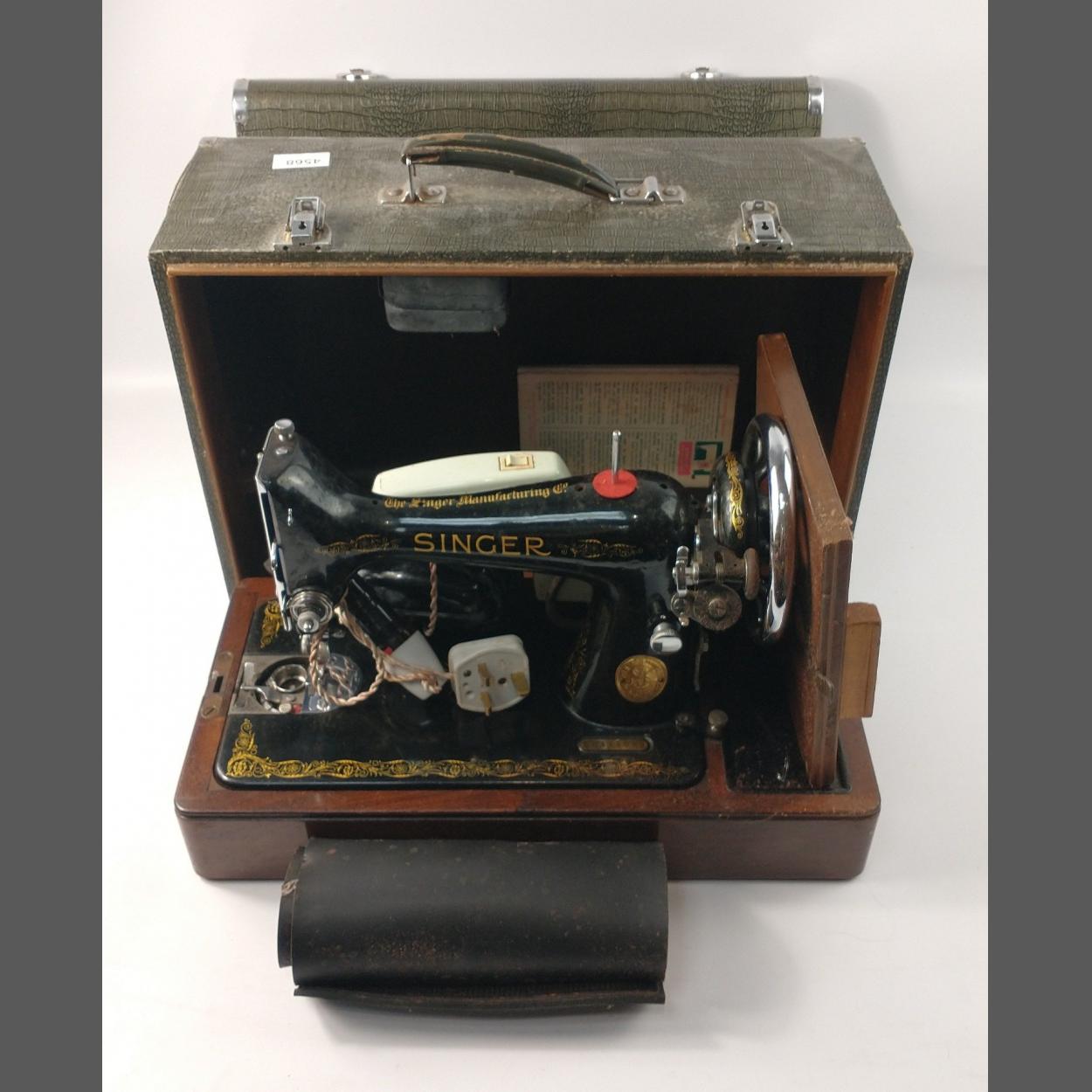 A vintage SINGER sewing machine serial no EB415089 (dates to June 1937) in original wooden case.