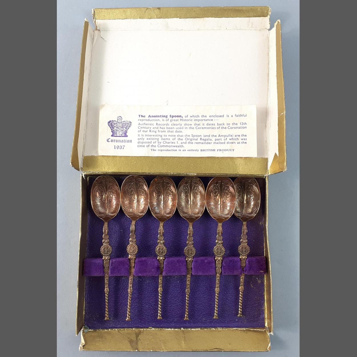 A set of 6 ANOINTING SPOONS from the 1937 Coronation within their original box. The original spoon dates back to the 12th century.