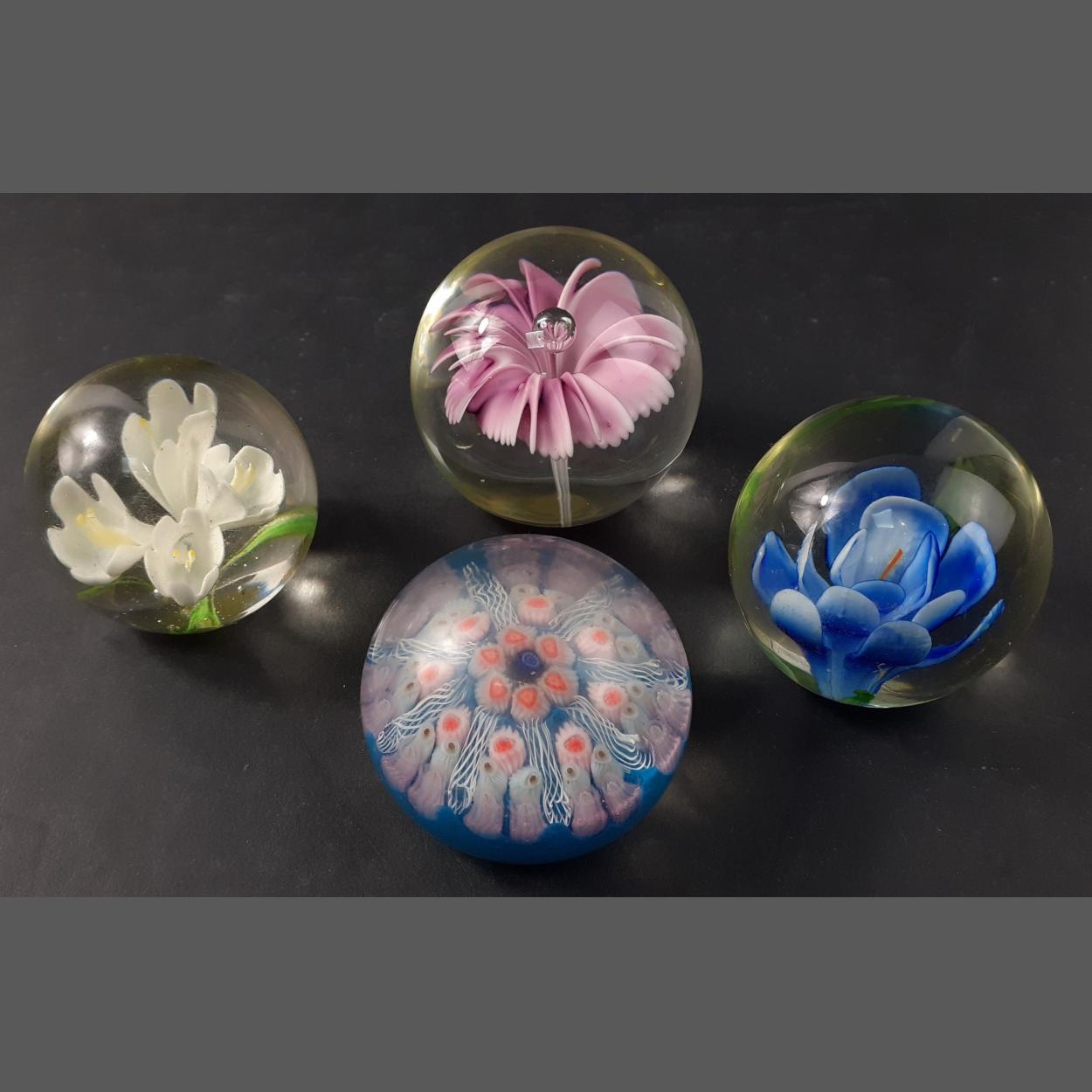 Four small paperweights including one millefiore from Strathearn and three others with floral theme