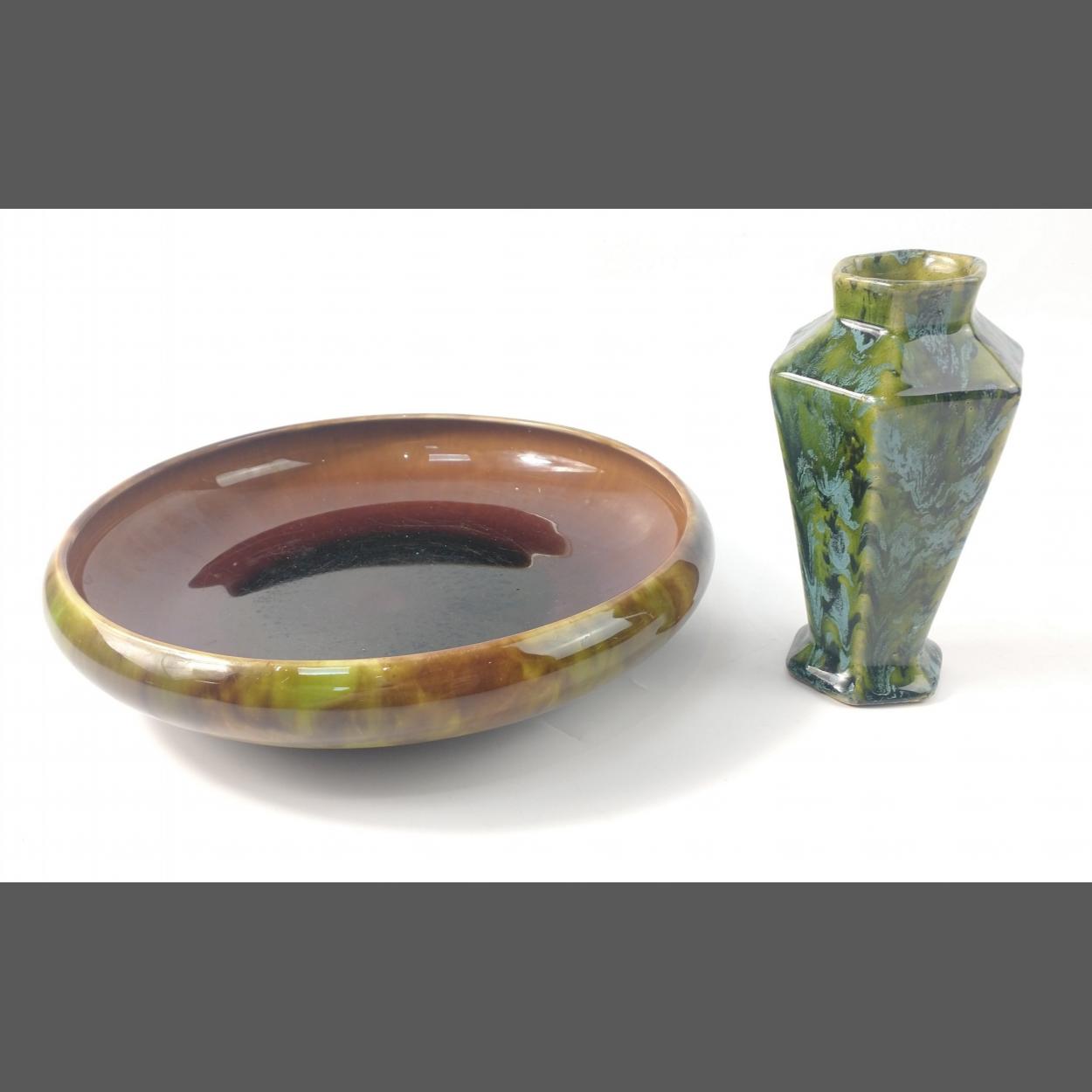 Two lovely pieces of Scottish studio pottery to include a beautiful 28cm shallow bowl (minor wear on inside) and a stunning small 16cm high drip ware tapered vase.