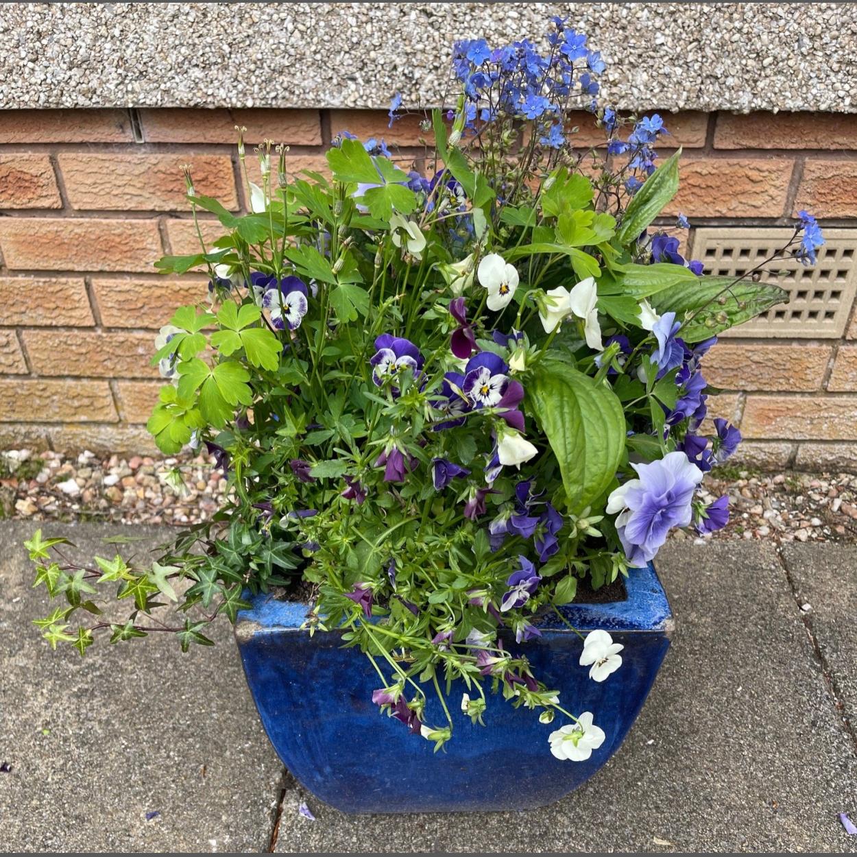 A blue ceramic planter with contents of pansies etc