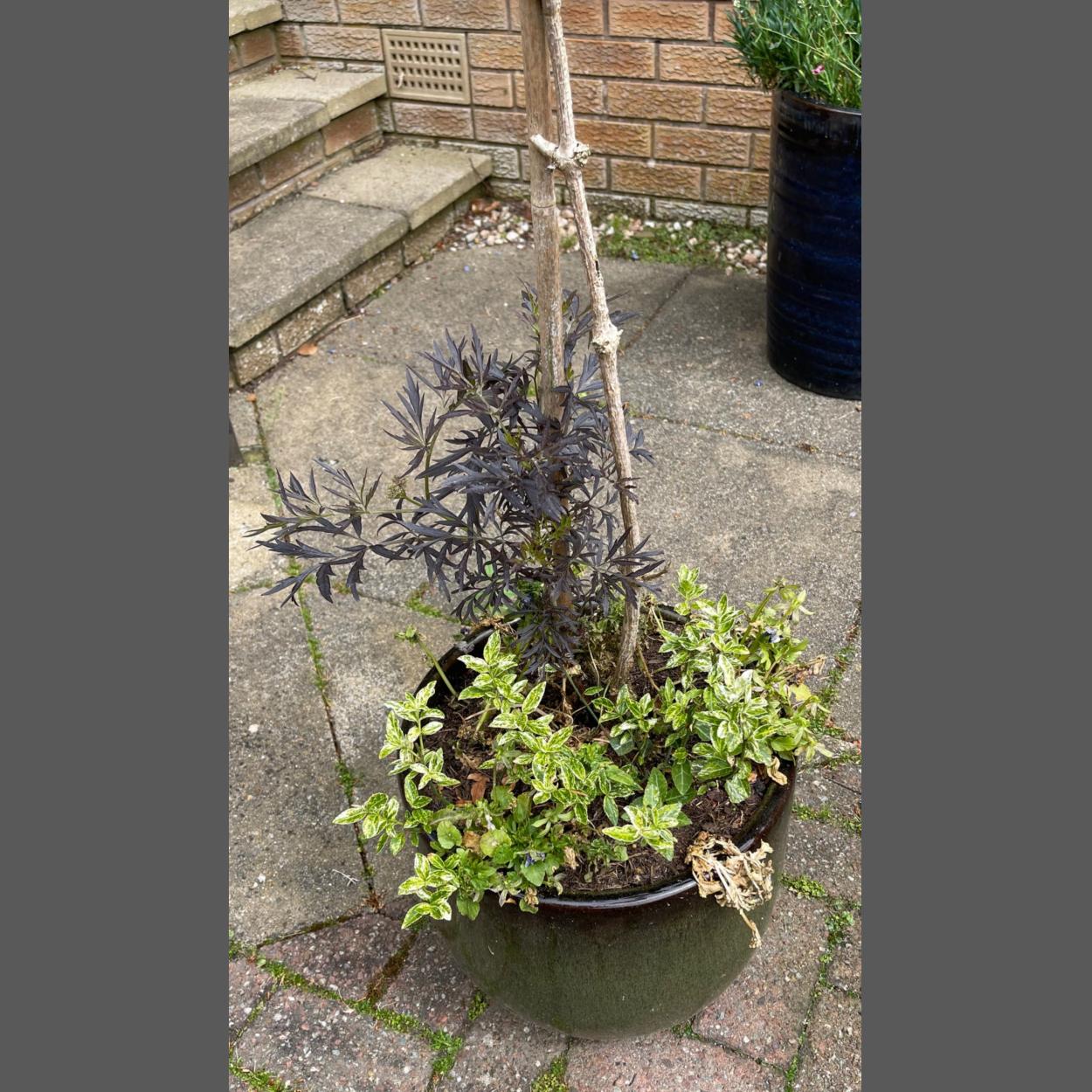 A green glaze ceramic garden planter pot with contents. 30cm and in excellent condition.