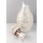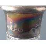 Two cut glass decanters with stoppers and silver collars hallmarked Birmingham 1946, each 29cm tall. One severely damaged