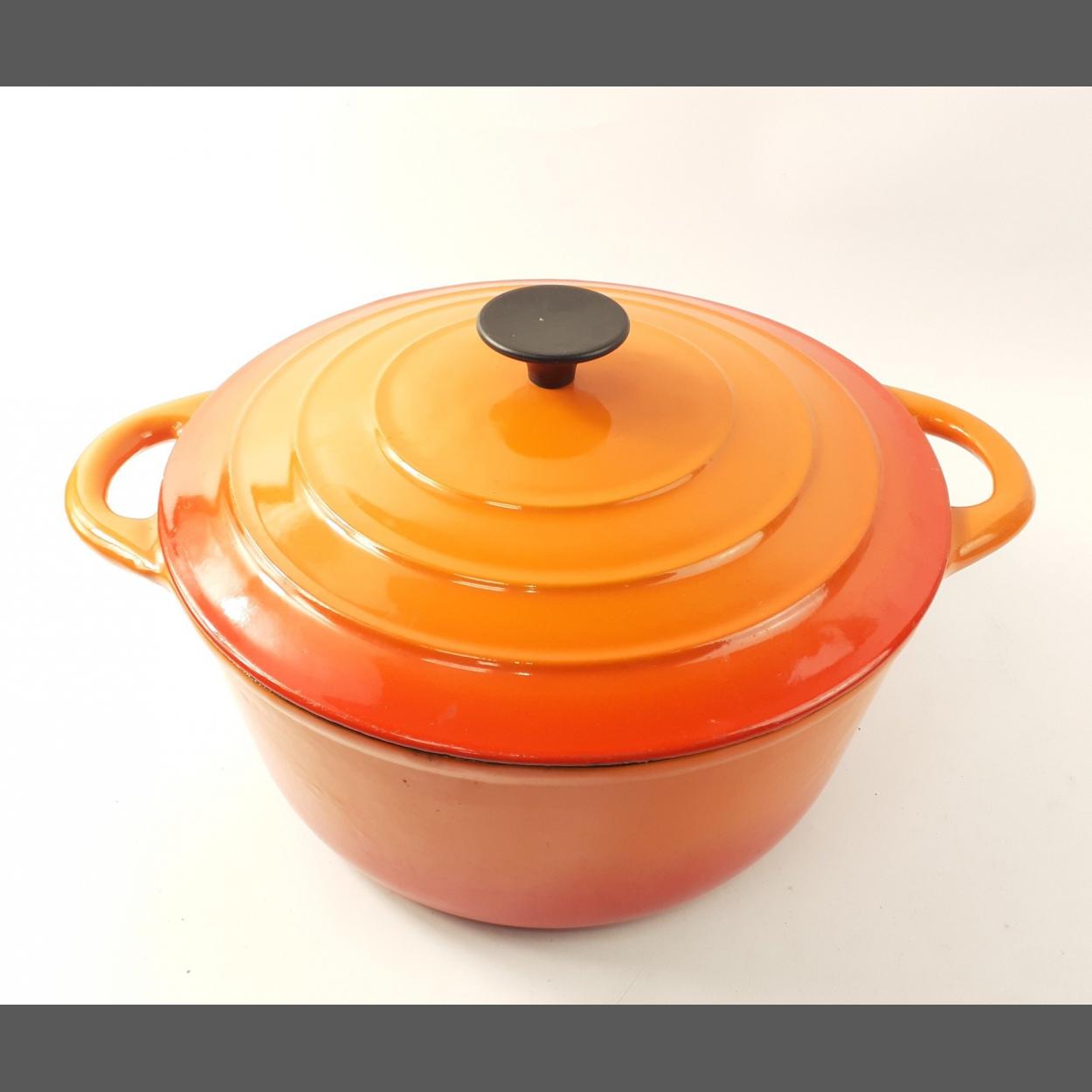 A large volcanic orange cast iron casserole dish 29cm diameter, 14cm tall