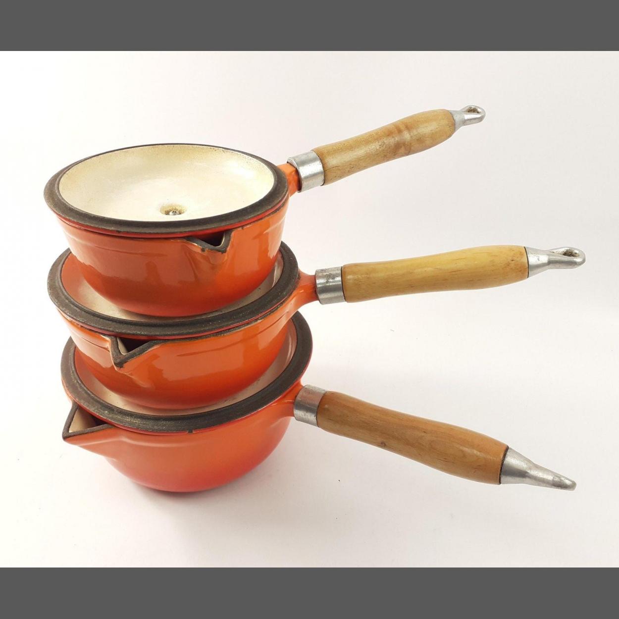 A set of 3 cast iron volcanic orange saucepans with lids smallest 15.5cm diameter, largest 19cm with wear
