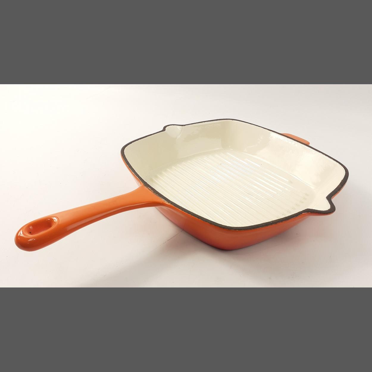 A cast iron square griddle pan in volcanic orange 26cm x 26cm. Appears unused.