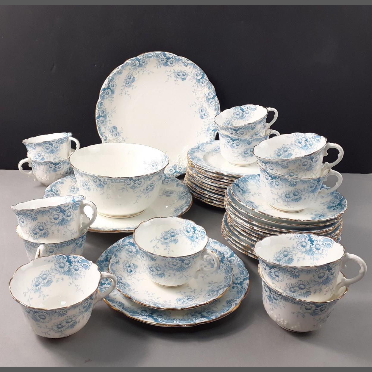 A RARE! AYNSLEY blue and white with gilt trim tea service comprising 12 cups, 12 saucers, 12 side plates, 2 sandwich plates, 1 large sugar bowl. Small crack in one side plate.