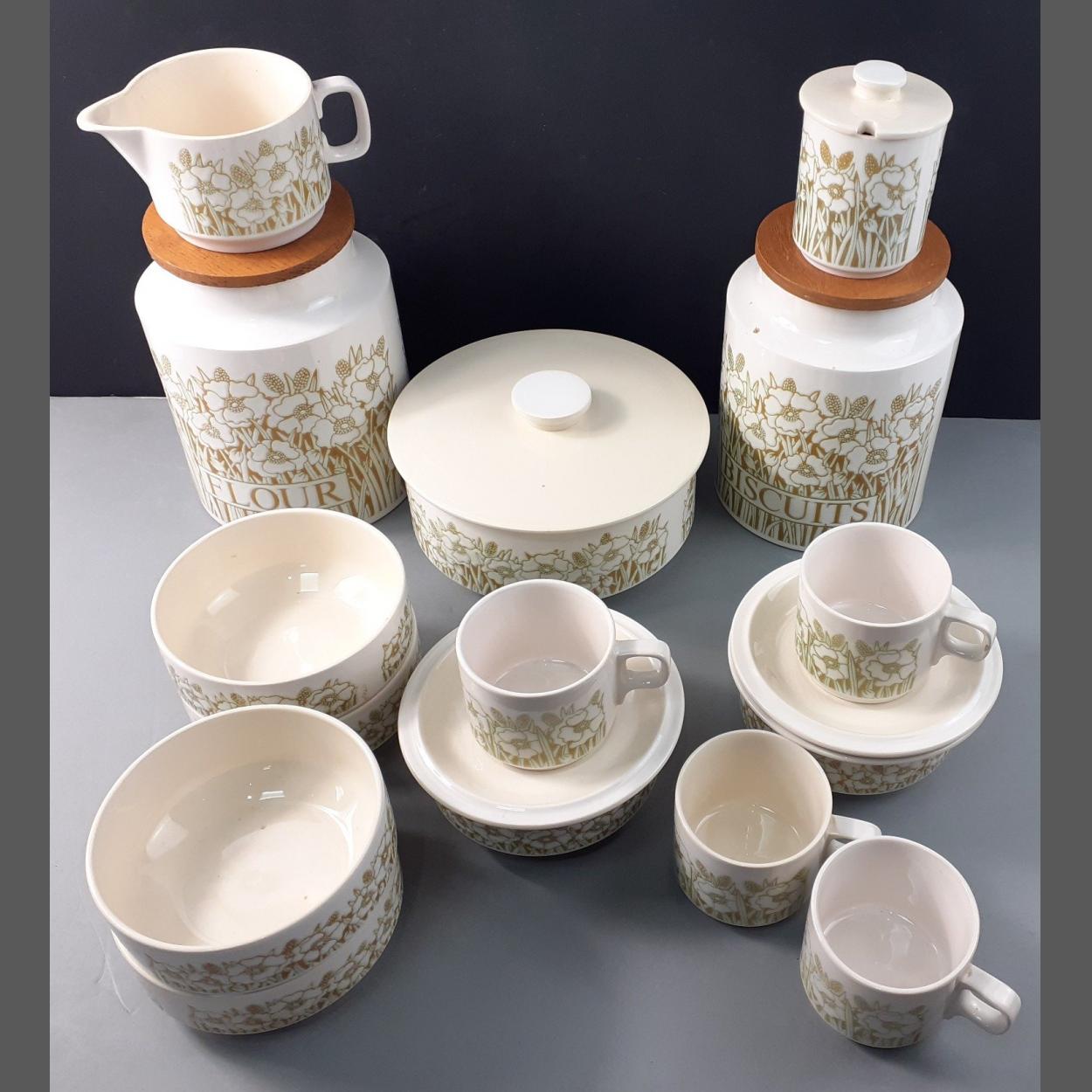 A mixed selection of HORNSEA pottery to include 1 biscuit barrel, a lidded jam pot, milk jug, 6 bowls, 1 flour bin, 6 cups (some with damaged handles), and 3 saucers
