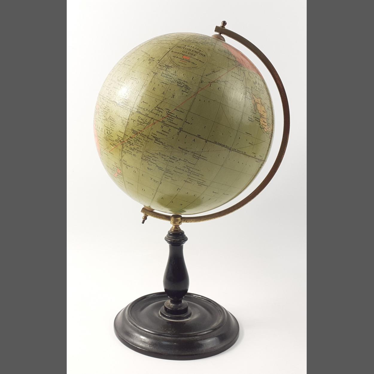 A true treasure. PHILIPS BRITISH EMPIRE GLOBE - an early 1900s - Globe of the world on wooden stand with brass mount. A beautiful conversation piece in superb condition. 35cm tall approximately