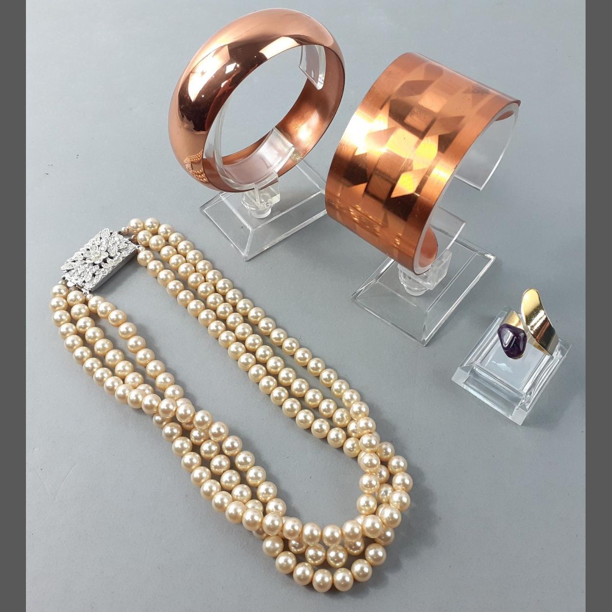 Beautiful necklet of imitation pearls, 2 copper bangles and 1 dress ring with an amythest like stone. Very attractive and would be a good addition to anyone's jewellery box.