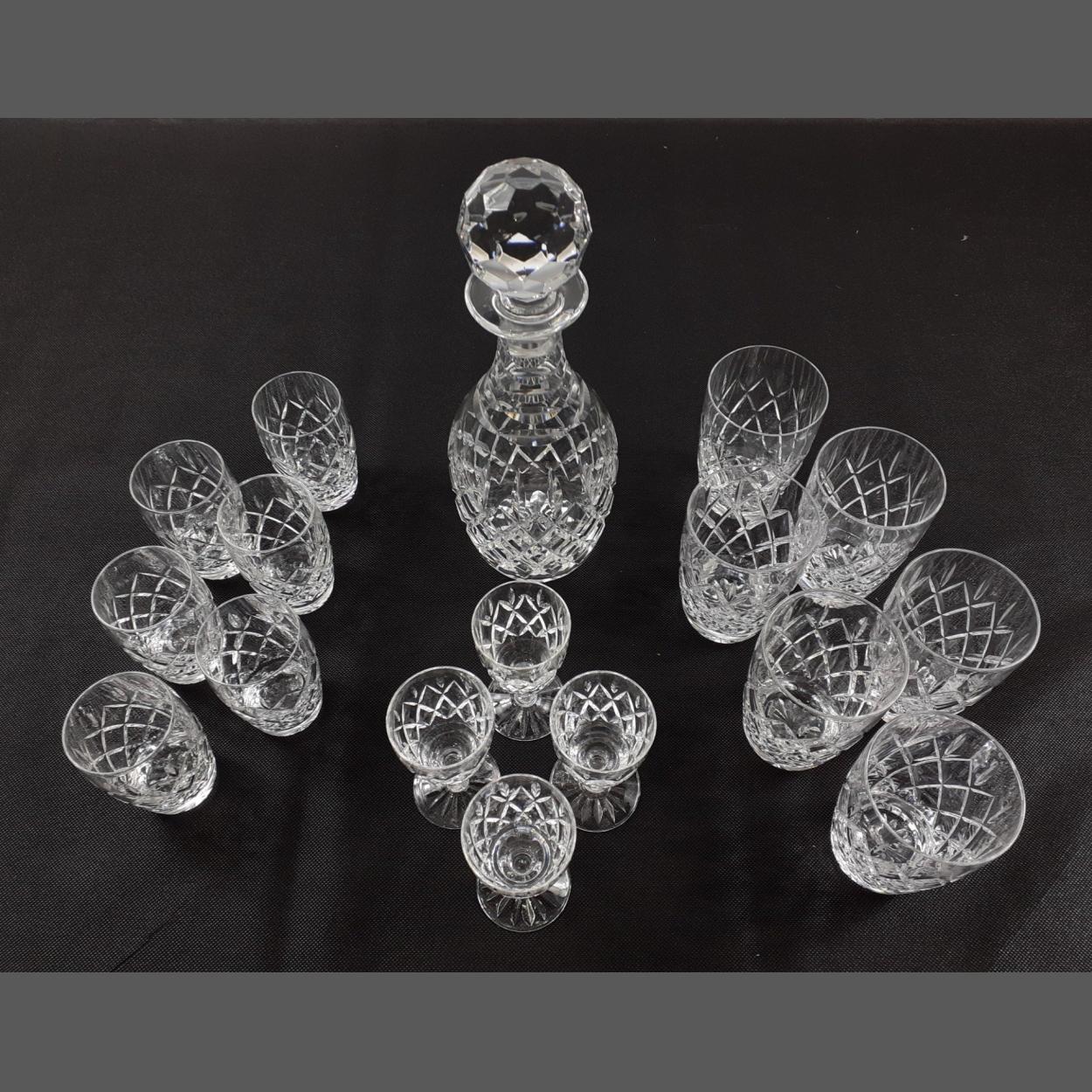 A beautiful Edinburgh Crystal decanter with 16 assorted glasses. All in good condtion.