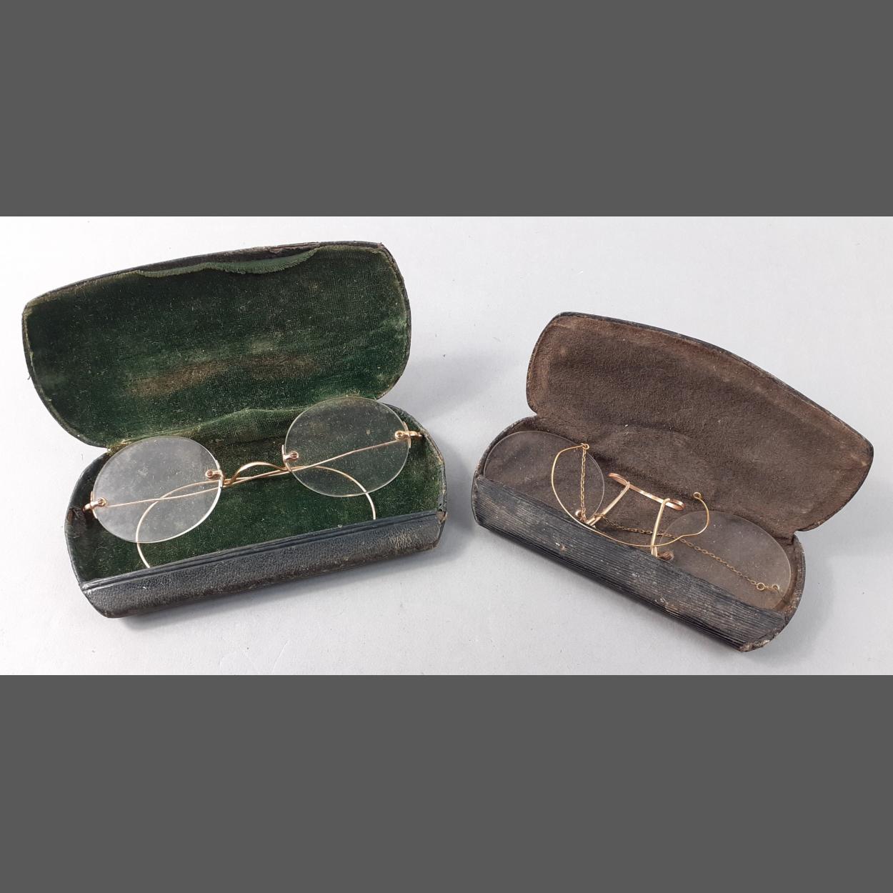Two pairs of antique spectacles in original cases, one with indistinct stamp on the bridge.