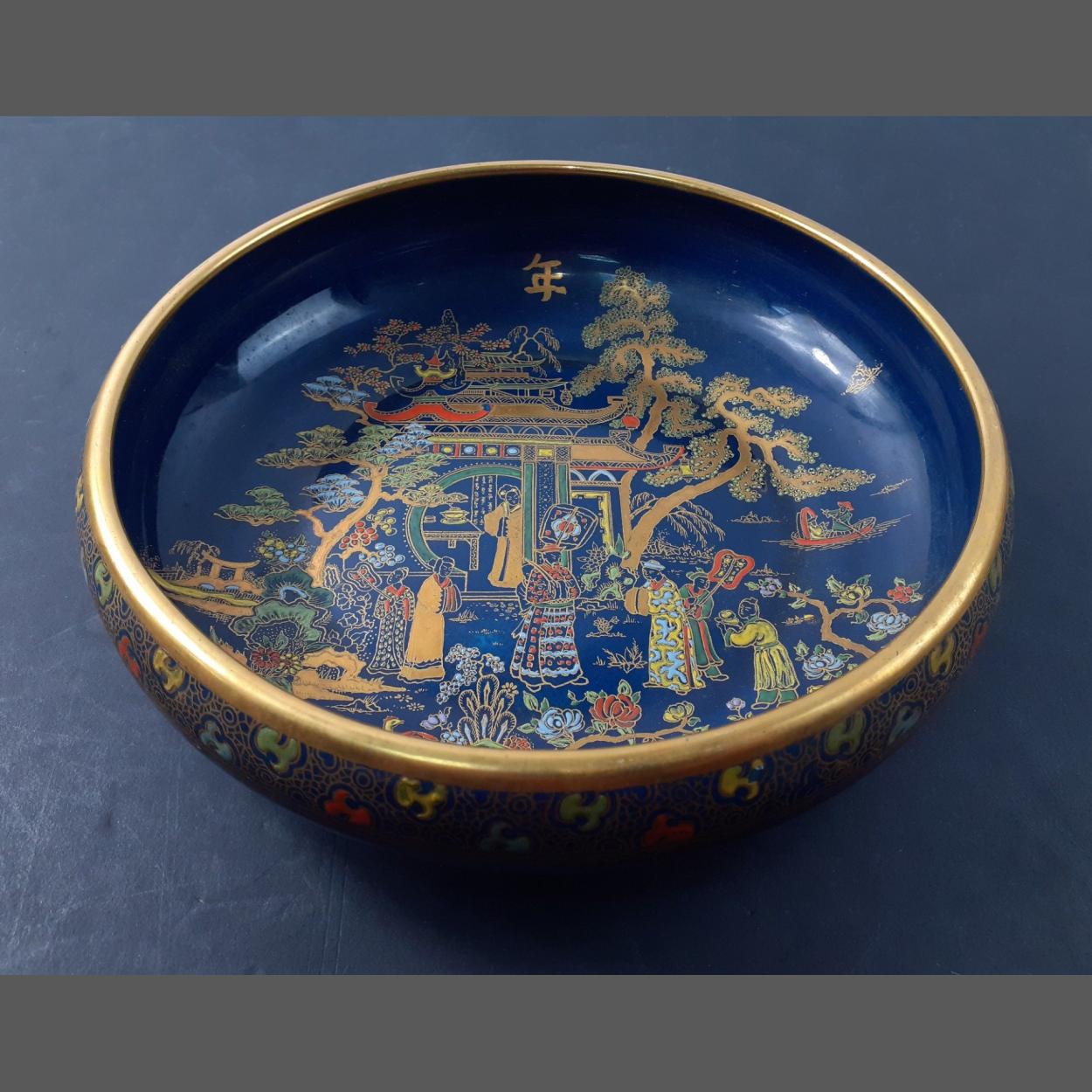 A particularly attractive Carltonware shallow bowl with oriental gilt pattern. 21cm approx across. Good condition. Original Carltonware label on bottom of the bowl.