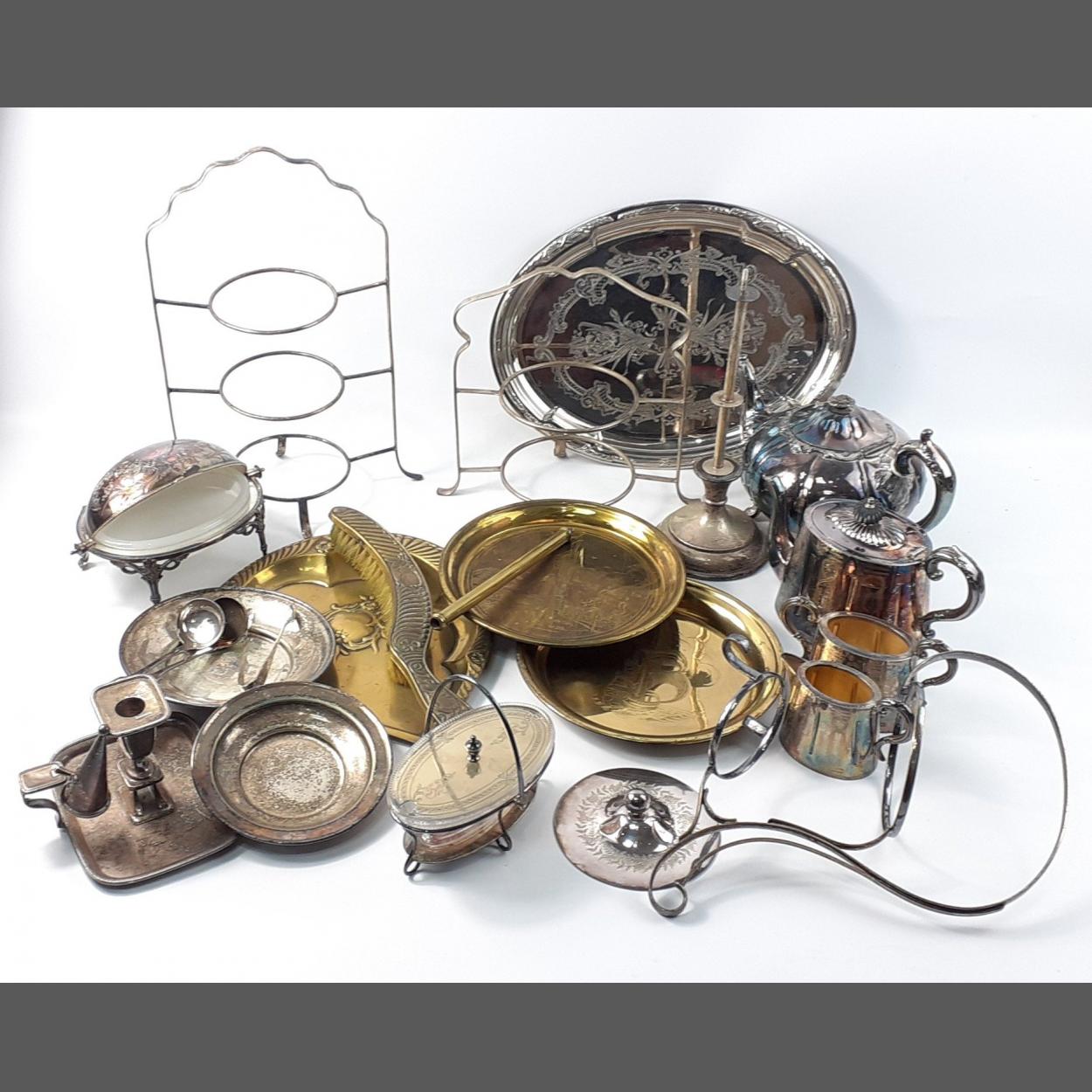 Super lot of EP plated items to include an attractive 35cm approx salver, roll top muffin warmer with glass liner, a pumpkin shaped teapot, a lovely plated candlestick with snuffer, various stands and brassware to include pan and brush etc.