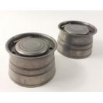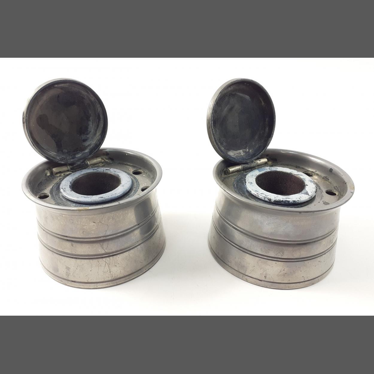 A pair of industrial style steel ink pots. In good complete condition despite seeing good use. Approx 6cm tall.