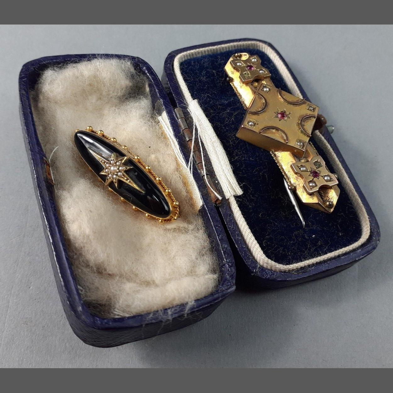 Two lovely Victorian brooches, one being an empty mourning locket with seed pearls and the other brooch intricately decorated with an interesting design.