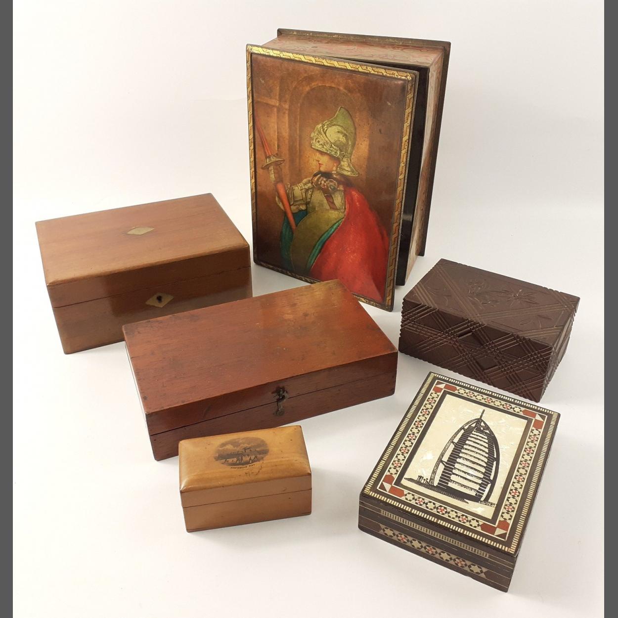 A super useful lot of tins and boxes including a Burj Al Arab box with mother of pearl decoration and a small MAUCHLINE box with Portobello Pier (damaged)