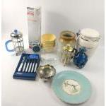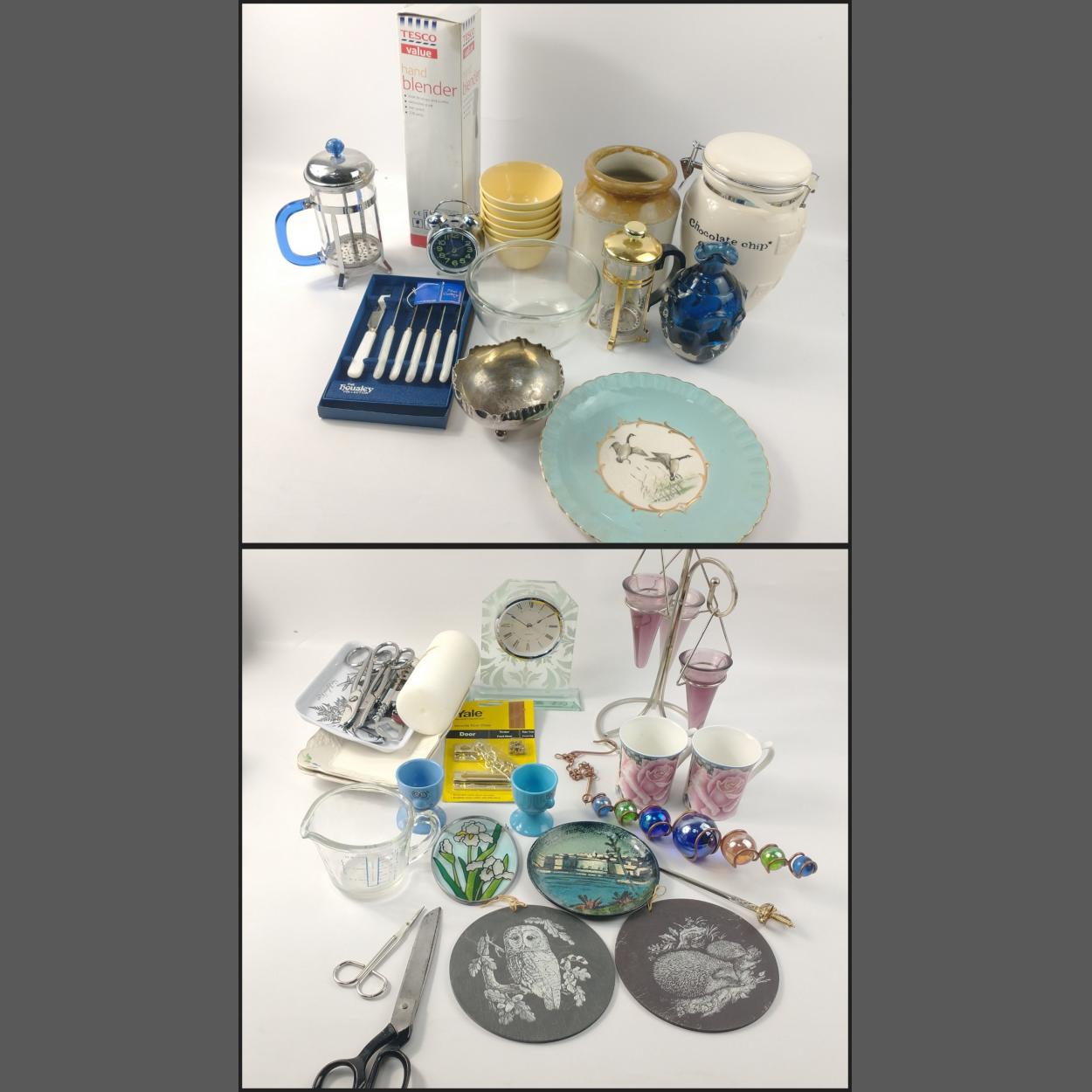 A mixed kitchen ware lot to include decorative items such as quartz clocks, a large cookie jar, stoneware jar, EPNS pieces, bowls, cafetieres, Tesco hand blender etc