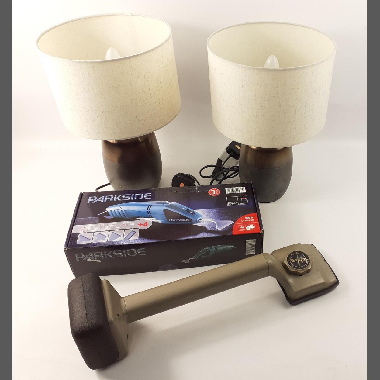 A mixed box to include a pair of NEXT table lamps with copper effect finish and cream shades, a PARKSIDE PEC200SE electric chisel in a box and a ROBERTS 409 carpet fitter's knee kicker