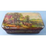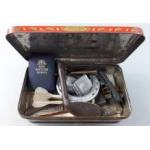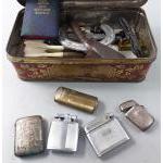 A vintage tin with contents to include a hallmarked silver lighter (hallmarked Birmingham 1903, weight 19g approx), a lighter with Association Football design, a Ronson, a mini set of spanners, 3 penknives, etc
