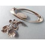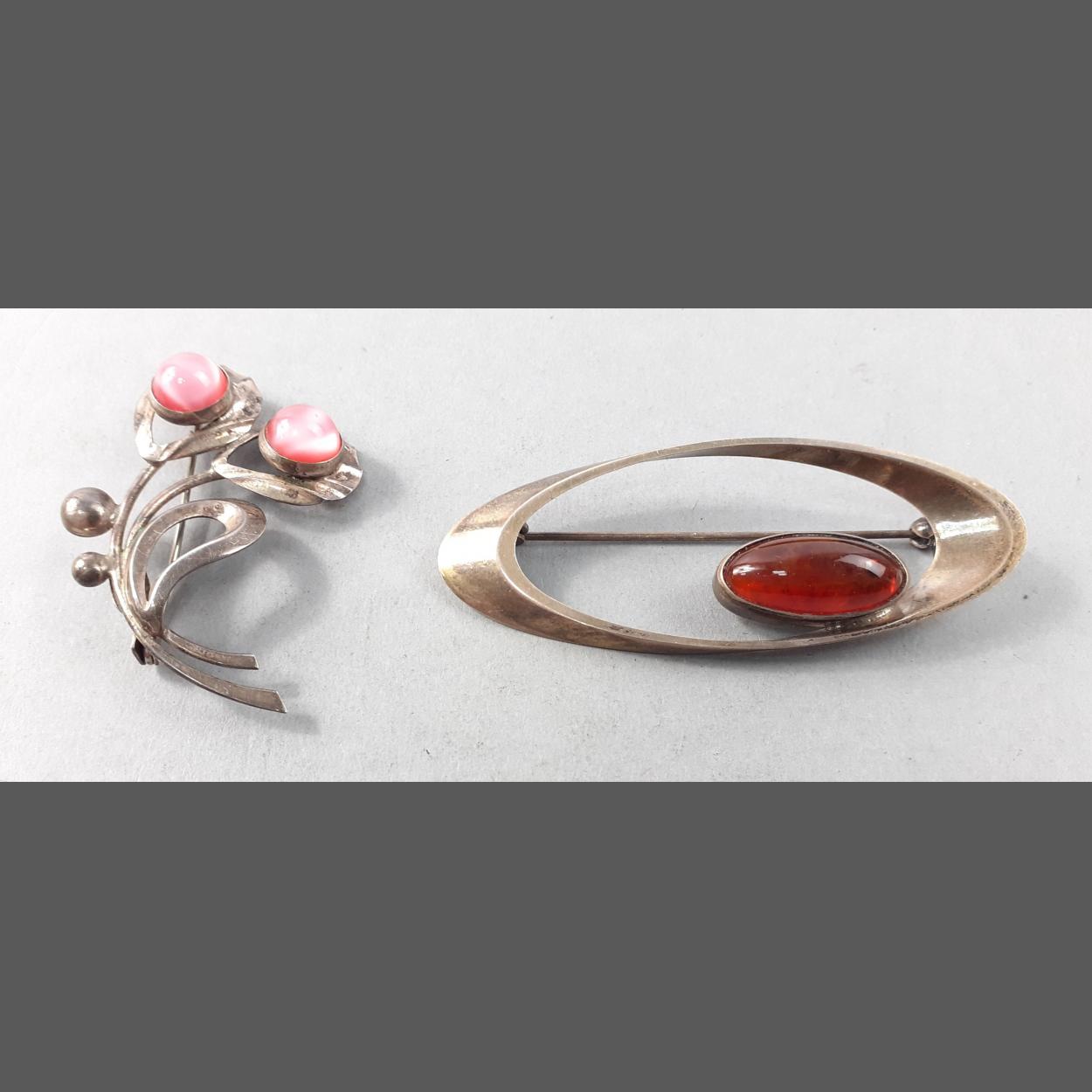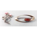Two rather attractive Danish silver brooches, one set with an amber coloured stone (6.5cm in length) and the other with 2 pink stones (5cm long)