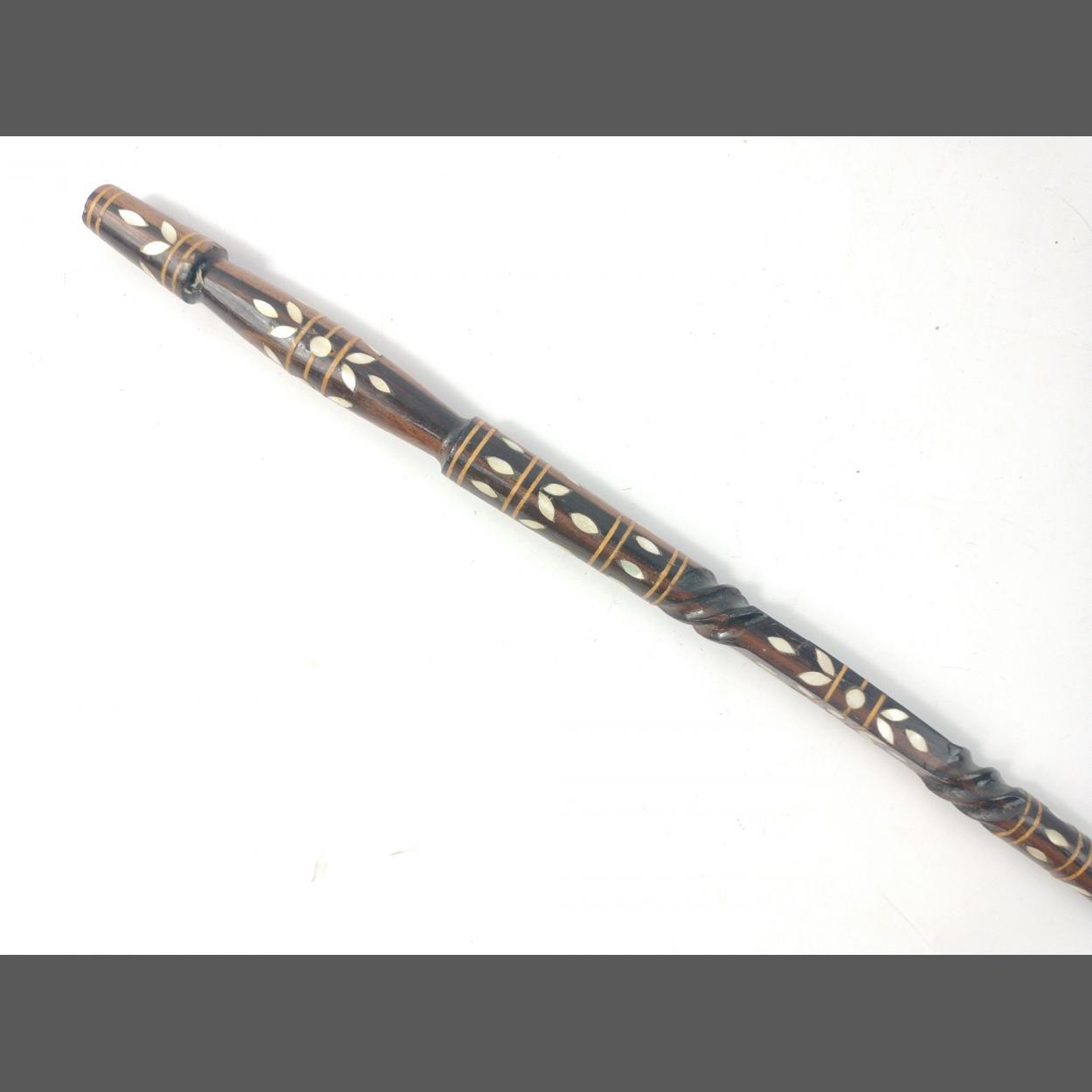 A beautifully made swagger stick with brass ferrule with inlaid mother-of-pearl leaf pattern. Length 64cm approx. A lovely quality item which would also work well as a wand.