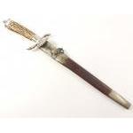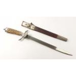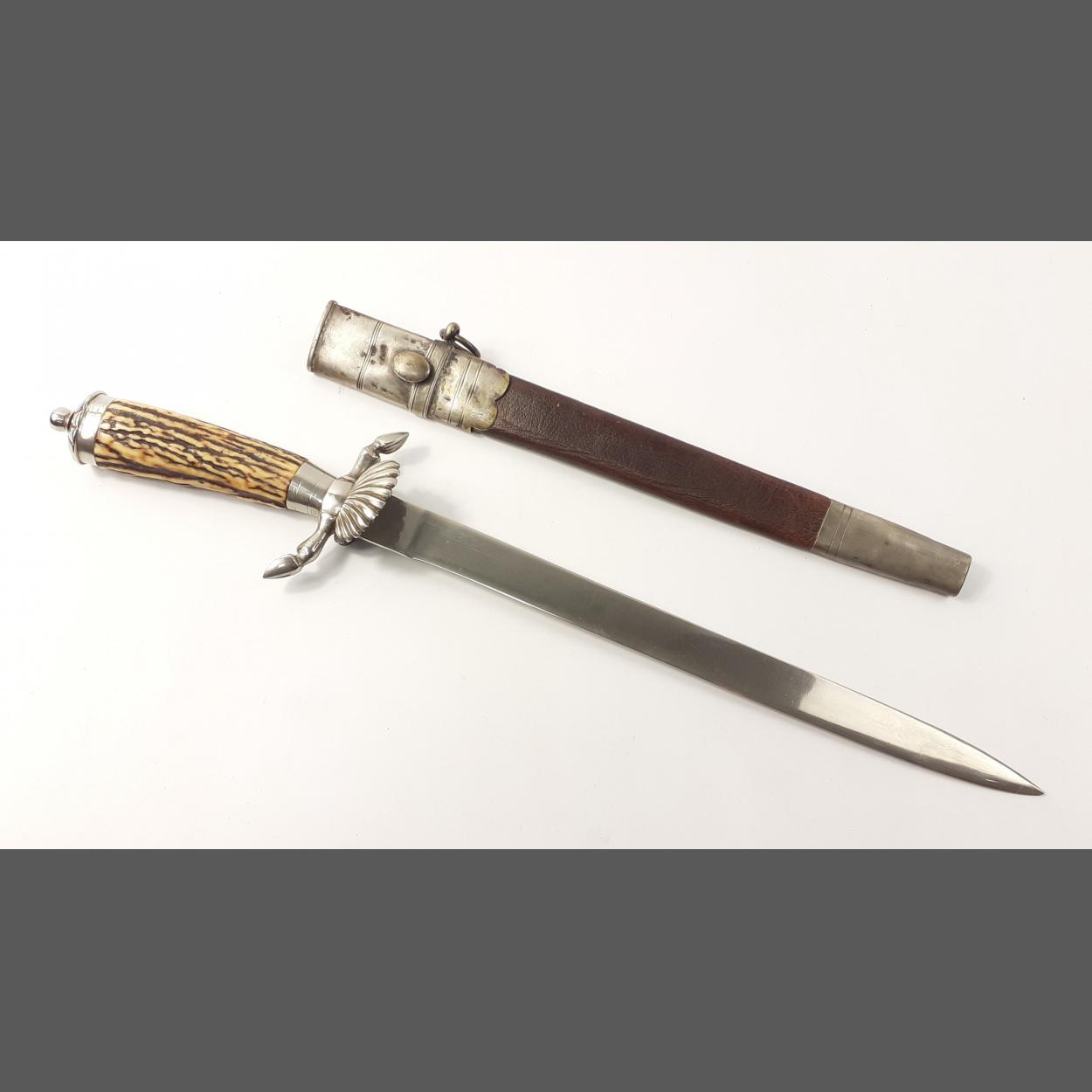 A late 19th century German's states large hunter's "pig-sticker" dagger with leather scabbard, horn handled and elaborate designed fittings including hoofs and clamshell design. A beautiful piece. Total length 49cm. Older repair noted to leather scabbard