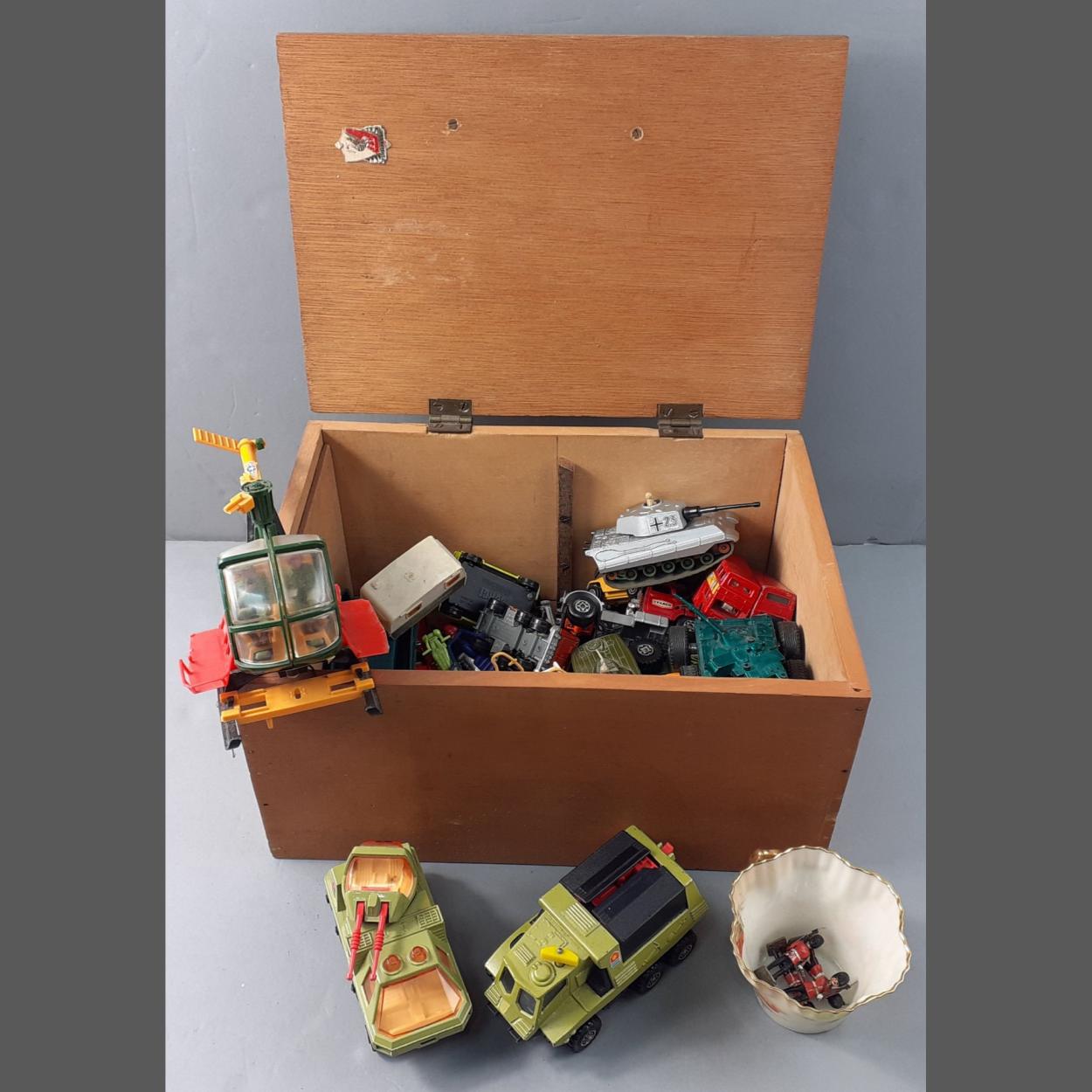 A box containing some interesting vintage diecast pieces to include several BRITAIN'S models and 3 MATCHBOX TV show pieces (Adventure 2000 etc)